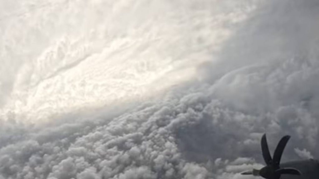 యూఎస్ఏఎఫ్ సీ-130జే హెరిక్యూల్స్ (టీఈఏఎల్74) విమనంలో స్టార్మ్ ఛేజర్స్ ఆ హరికేన్ వీడియోను తీశారు. పైనుంచి మహాభీకరంగా కనిపిస్తున్న హరికేన్ మధ్య భాగంలో ప్రశాంతంగా ఉన్నట్లు వీడియోలో కనిపించింది. టీఎల్ 74టీమ్ కాక్పిట్ పుటేజ్ను రిలీజ్ చేశారు. వైరల్ అవుతున్న వీడియోలో తెల్లటి మేఘాలు వలయాకారంలో ముందుకు వెళ్తున్నట్లు కనిపిస్తున్నాయి. ఆ దట్టమైన తెల్లటి మేఘాల సమూహాన్ని చీల్చుకుంటూ డబ్ల్యూసీ-130జే విమానం దూసుకెళ్లింది. కొన్ని మైళ్ల మేర ఆ మేఘాల వలయం ఉంది. ఆకాశంలో నిర్మించిన స్పోర్ట్స్ స్టేడియం పైకప్పు తరహాలో సర్క్యూర్ స్పేస్ కనిపిస్తుంది.
