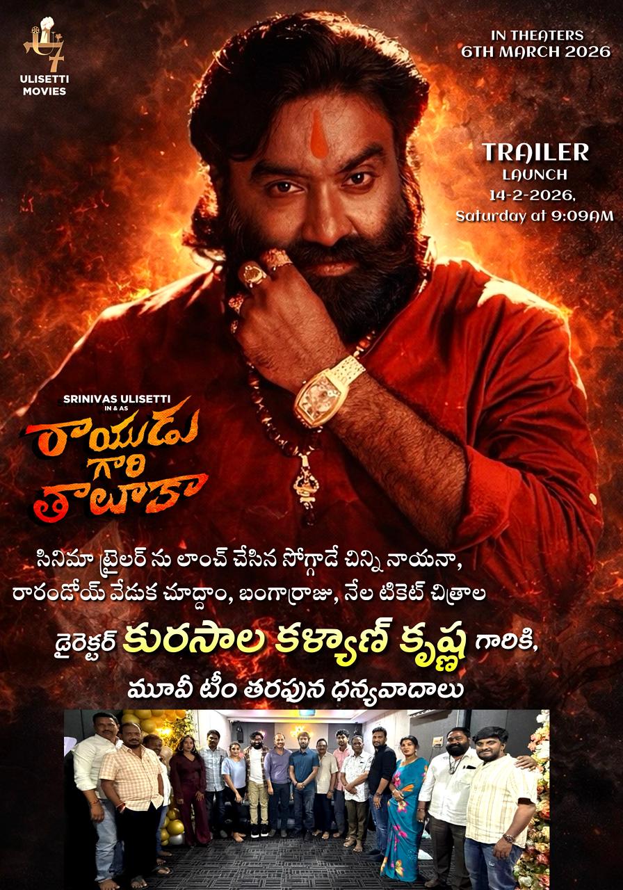 ట్రైలర్ రిలీజ్ అనంతరం కల్యాణ్ కృష్ణ మాట్లాడుతూ.. ట్రైలర్ బాగుంది. ఈ సినిమా గురించి చాలా మంది ద్వారా విన్నాను. ఇటీవల కాలంలో ఇలాంటి కథ రాలేదు అంటూ టీం అందరికీ నా బెస్ట్ విషెస్ చెప్పారు. హీరో, నిర్మాత ఉలిశెట్టి శ్రీనివాసరావు మాట్లాడుతూ.. ఇది కుటుంబ చిత్రమే. కుటుంబ విలువలు తెలిపే ఒక మంచి సినిమా అవుతుంది. ఈ సినిమాని మార్చి 6వ తేదీన రిలీజ్ చేయబోతున్నాం అని తెలిపారు.