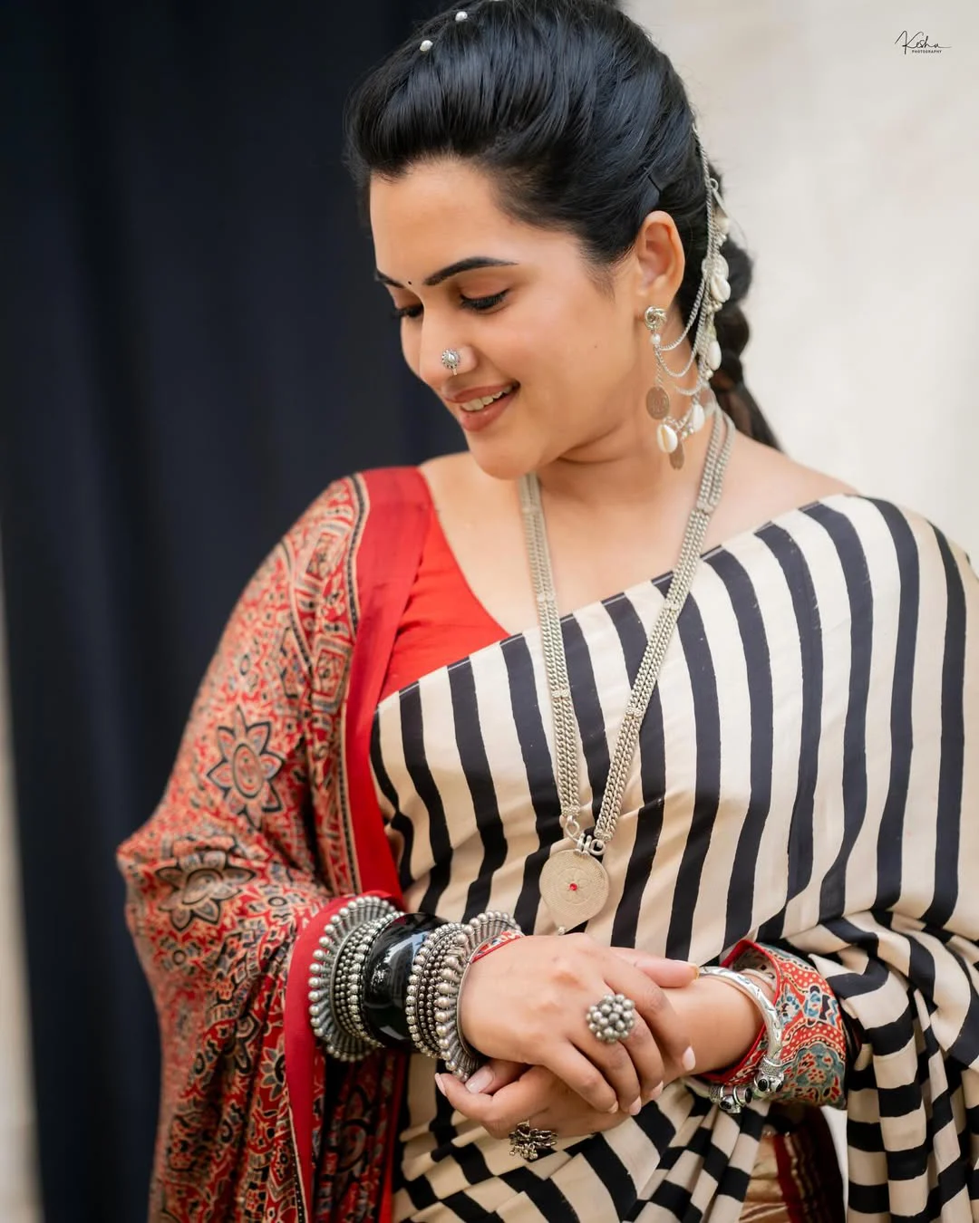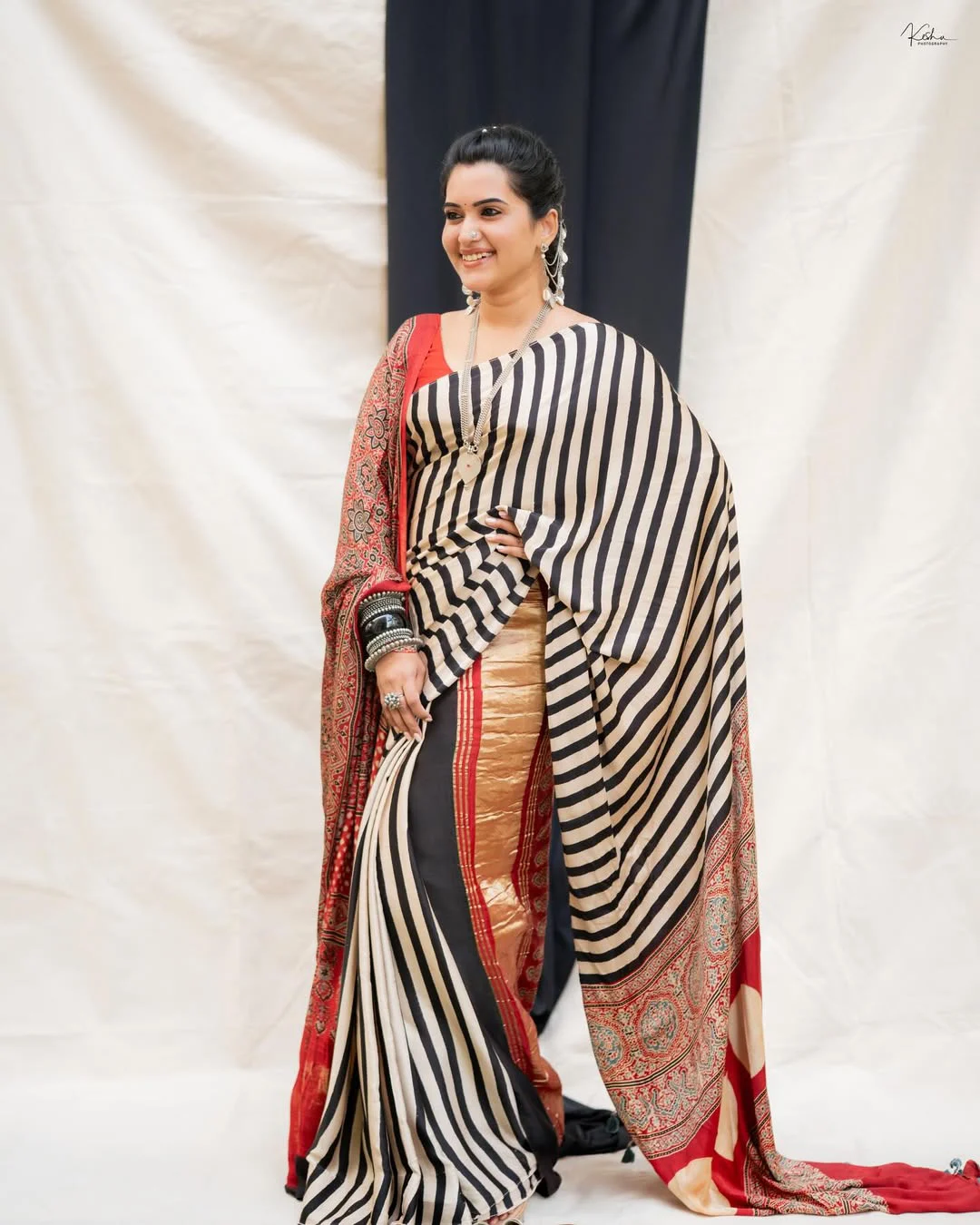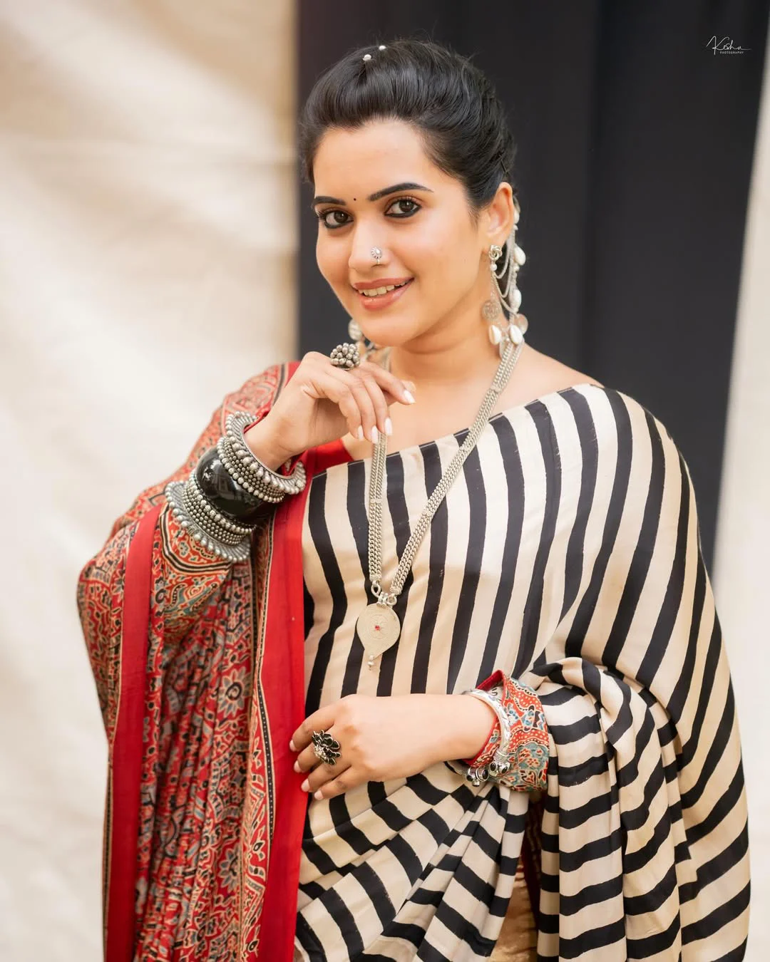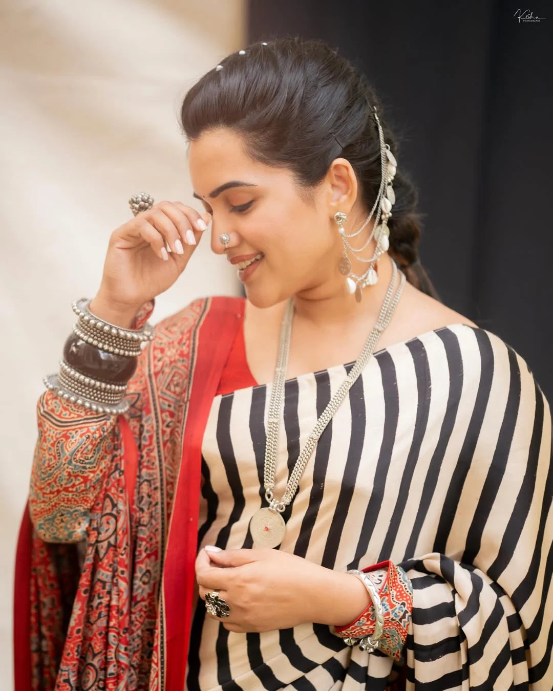 యాంకర్ స్రవంతి (Sravanthi Chokarapu) నలుపు, తెలుపు రంగు చీరలో దిగిన ఫోటోలను తన సోషల్ మీడియాలో షేర్ చేసింది.