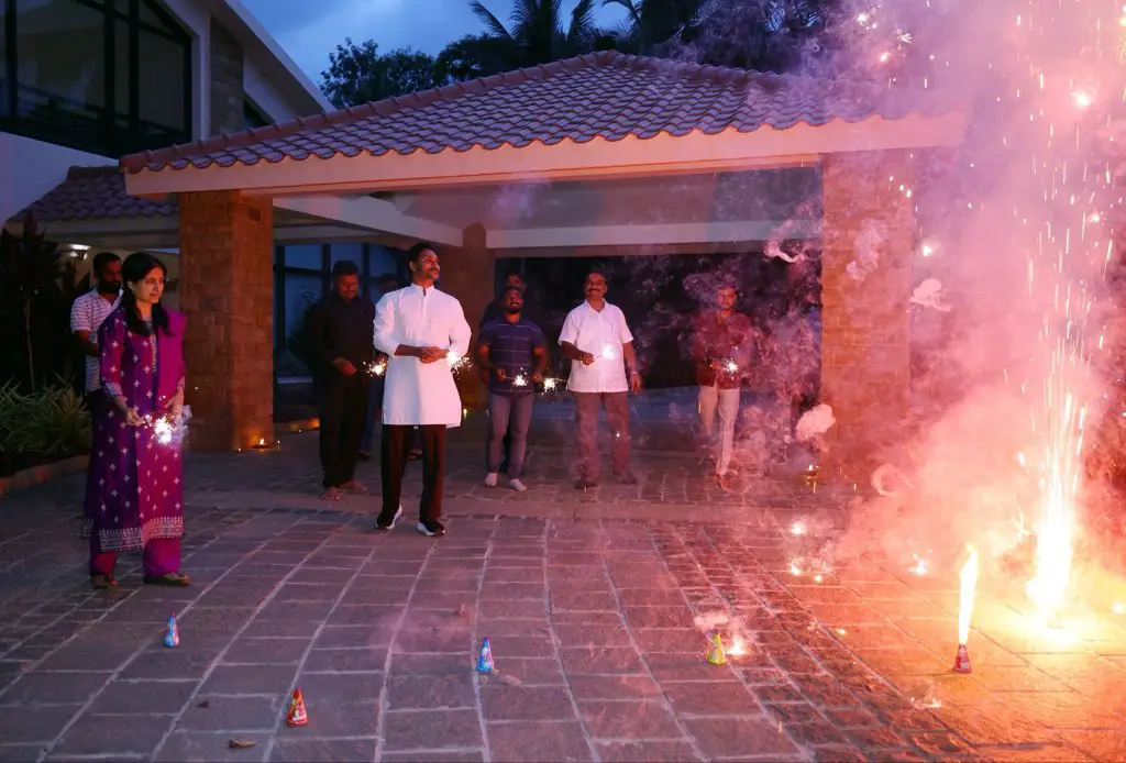 YS Jagan Deepavali Celebrations : దీపావళి వేడుకల్లో మాజీ ముఖ్యమంత్రి, వైసీపీ అధినేత వైఎస్ జగన్మోహన్ రెడ్డి దంపతులు పాల్గొన్నారు. బెంగళూరులోని వారి నివాసంలో వైఎస్ జగన్, వైఎస్ భారతిలు టపాసులు పేల్చారు. దీపావళి పండుగ అందరి జీవితాల్లో మరిన్ని వెలుగులు తీసుకురావాలని కోరుకుంటూ ప్రపంచ వ్యాప్తంగా ఉన్న తెలుగు వారందరికీ వైయస్ జగన్ దంపతులు దీపావళి శుభాకాంక్షలు తెలిపారు.