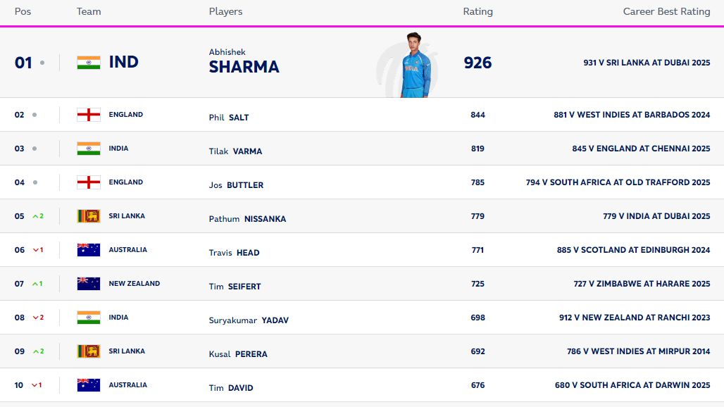ఆసియా కప్ సెమీఫైనల్లో శ్రీలంకపై అభిషేక్ శర్మ 931 రేటింగ్ పాయింట్లతో కెరీర్లో అత్యధిక రికార్డు సాధించాడు (ప్రపంచ రికార్డు, కెరీర్ బెస్ట్ రేటింగ్). కానీ ఫైనల్లో పాకిస్థాన్పై 5 పరుగులు మాత్రమే చేశాడు. దీంతో అతడి రేటింగ్ ఇప్పుడు కొద్దిగా తగ్గింది. ఐసీసీ వీక్లీ అప్డేట్లో అతడి అధికారిక రేటింగ్ 926 పాయింట్లుగా నిలిచింది. ఇప్పటికీ ప్రపంచంలో 1వ స్థానంలోనే ఉన్నాడు.