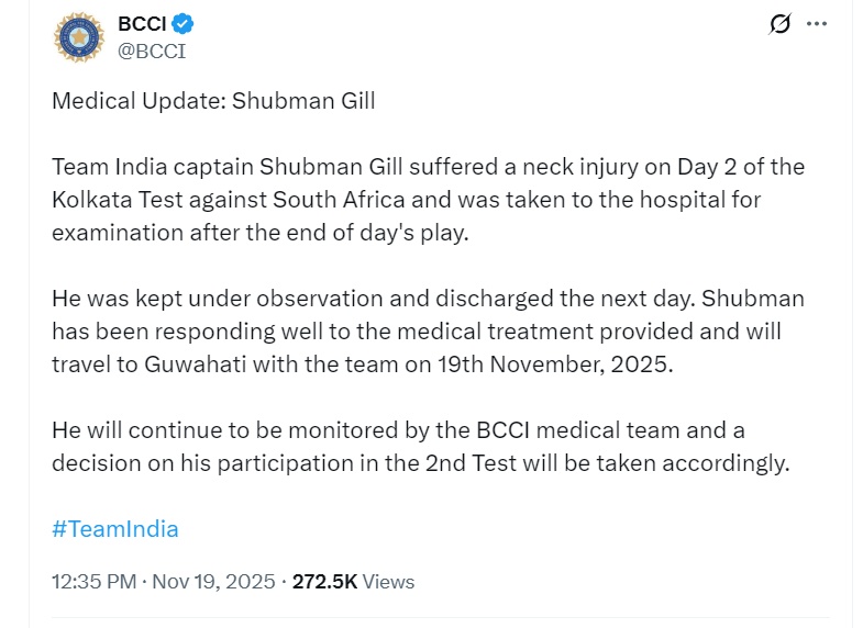 కాగా.. తాజాగా భారత క్రికెట్ కంట్రోల్ బోర్డు (బీసీసీఐ) శుభ్మన్ గిల్ గాయంపై అప్డేట్ ఇచ్చింది. ‘దక్షిణాఫ్రికాతో కోల్కతా వేదికగా జరిగిన తొలి టెస్టు మ్యాచ్ రెండో రోజు ఆటలో శుభ్మన్ గిల్ మెడకు గాయమైంది. వెంటనే అతడిని ఆస్పత్రికి తరలించాము. ఒక రోజు చికిత్స అనంతరం అతడు ఆస్పత్రి నుంచి డిశ్చార్జి అయ్యాడు.’ అని తెలిపింది.