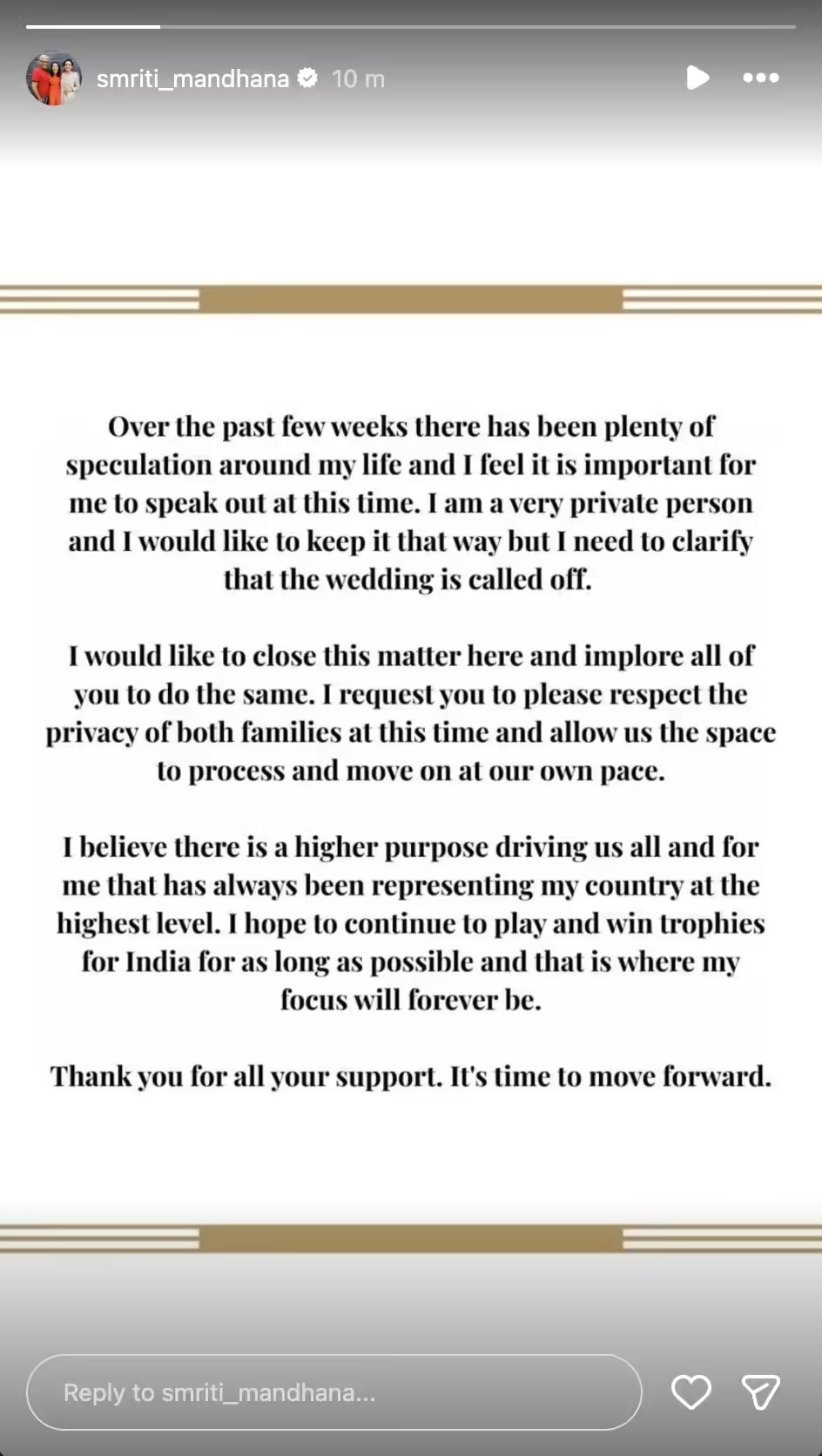 ‘గత కొన్ని వారాలుగా నా జీవితం చుట్టూ చాలా ఊహాగానాలు వస్తున్నాయి. ఇలాంటి సమయంలో నేను మాట్లాడటం ఎంతో ముఖ్యం అని భావిస్తున్నాను. నా గురించి అన్నీ గోప్యంగా ఉండాలని భావించే వ్యక్తిని నేను. అలాగే ఉంచుతాను కూడా. అయితే.. నా పెళ్లి రద్దు అయింది. ఈ విషయాన్ని అందరికి స్పష్టంగా చెబుతున్నాను.’ అని మంధాన ఇన్స్టాగ్రామ్లో రాసుకొచ్చింది.