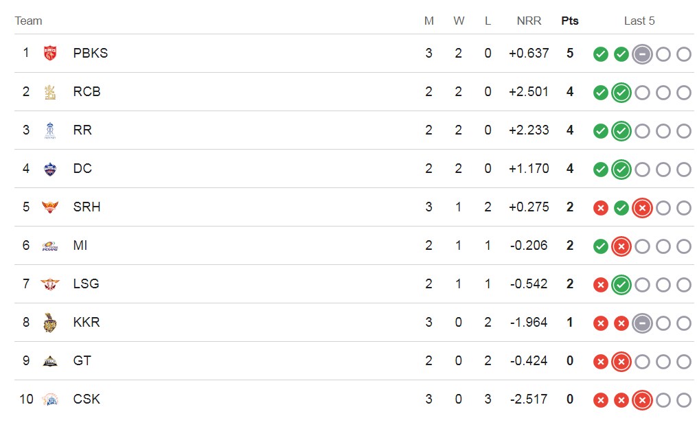 తాజా మ్యాచ్తో కలిసి పంజాబ్ కింగ్స్ మూడు మ్యాచ్లు ఆడింది. ఇందులో రెండు మ్యాచ్ల్లో విజయం సాధించగా వర్షం కారణంగా ఓ మ్యాచ్ రద్దు కావడంతో ఆ జట్టు ఖాతాలో 5 పాయింట్లు వచ్చి చేరాయి.