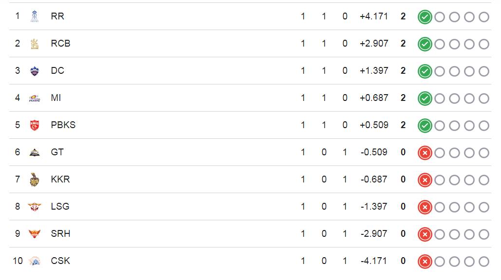 IPL Points Table 2026 After 10 teams complete thier first matches