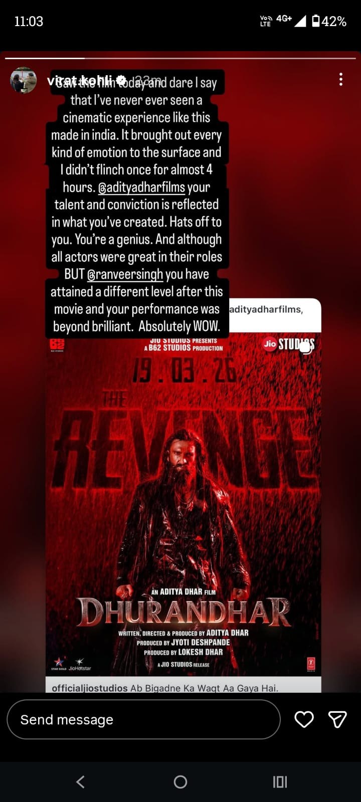 ‘ఈరోజు సినిమా చూశాను. ఇలాంటి ఓ అద్భుతమైన సినిమా అనుభవాన్ని భారతీయ సినిమాల్లో ఇంతకముందు ఎన్నడూ చూడలేదని చెప్పగలను. అన్ని రకాల భావోద్వేగాలను బయటకు తీసుకువచ్చింది. దాదాపు 4 గంటల పాటు నేను ఒక్కసారి కూడా కనురెప్ప వేయలేదు. ఆదిత్య .. మీ ప్రతిభ, పట్టుదల మీరు సృష్టించిన ఈ అద్భుతంలో కనిపిస్తున్నాయి. మీకు హ్యాట్స్ ఆఫ్. మీరు ఒక మేధావి. నటీనటులందరూ తమ పాత్రలలో అద్భుతంగా ఒదిగిపోయినప్పటికి కూడా రణ్వీర్సింగ్ ఈ చిత్రం తరువాత మీరు ఓ కొత్త శిఖరాన్ని చేరుకున్నారు. మీ నటన అద్భుతానికి మించినది. వావ్.’ అని కోహ్లీ తన ఇన్స్టాగ్రామ్ స్టోరీలో రాసుకొచ్చారు.