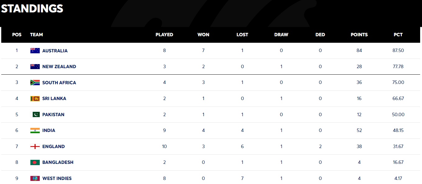 ప్రస్తుత సైకిల్లో ఇంగ్లాండ్ 10 మ్యాచ్లు ఆడగా మూడు మ్యాచ్ల్లో గెలుపొందింది. మరో 6 మ్యాచ్ల్లో ఓడిపోయింది. ఓ మ్యాచ్ డ్రాగా ముగిసింది. ఆ జట్టు విజయశాతం 31.67గా ఉంది. పాయింట్ల పట్టికలో ఇంగ్లాండ్ తరువాతి స్థానాల్లో బంగ్లాదేశ్, వెస్టిండీస్ జట్లు మాత్రమే వరుసగా ఎనిమిది, తొమ్మిది స్థానాల్లో ఉన్నాయి.