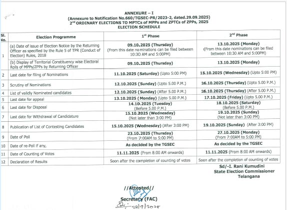 రెండో విడతలో భాగంగా 2,786 ఎంపీటీసీ, 273 జడ్పీటీసీ స్థానాలకు ఎన్నికలు నిర్వహిస్తారు. అక్టోబర్ 13న నామినేషన్ల స్వీకరణ ప్రక్రియను మొదలు పెట్టి.. ఈ నెల 15వ తేదీన ముగిస్తారు. అక్టోబర్ 16వ తేదీన నామినేషన్ల పరిశీలన, అక్టోబర్ 19వ తేదీ వరకు నామినేషన్ల ఉపసంహరణకు అవకాశం కల్పించారు. అక్టోబర్ 27న పోలింగ్ నిర్వహిస్తారు. నవంబర్ 11వ తేదీన రెండు విడతలకు సంబంధి ఓట్ల లెక్కింపు, ఫలితాలు వెల్లడిస్తారు.